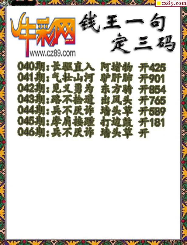 首页 > 福彩3D图谜 > 福彩3D2026046期钱王一句定三码字图谜